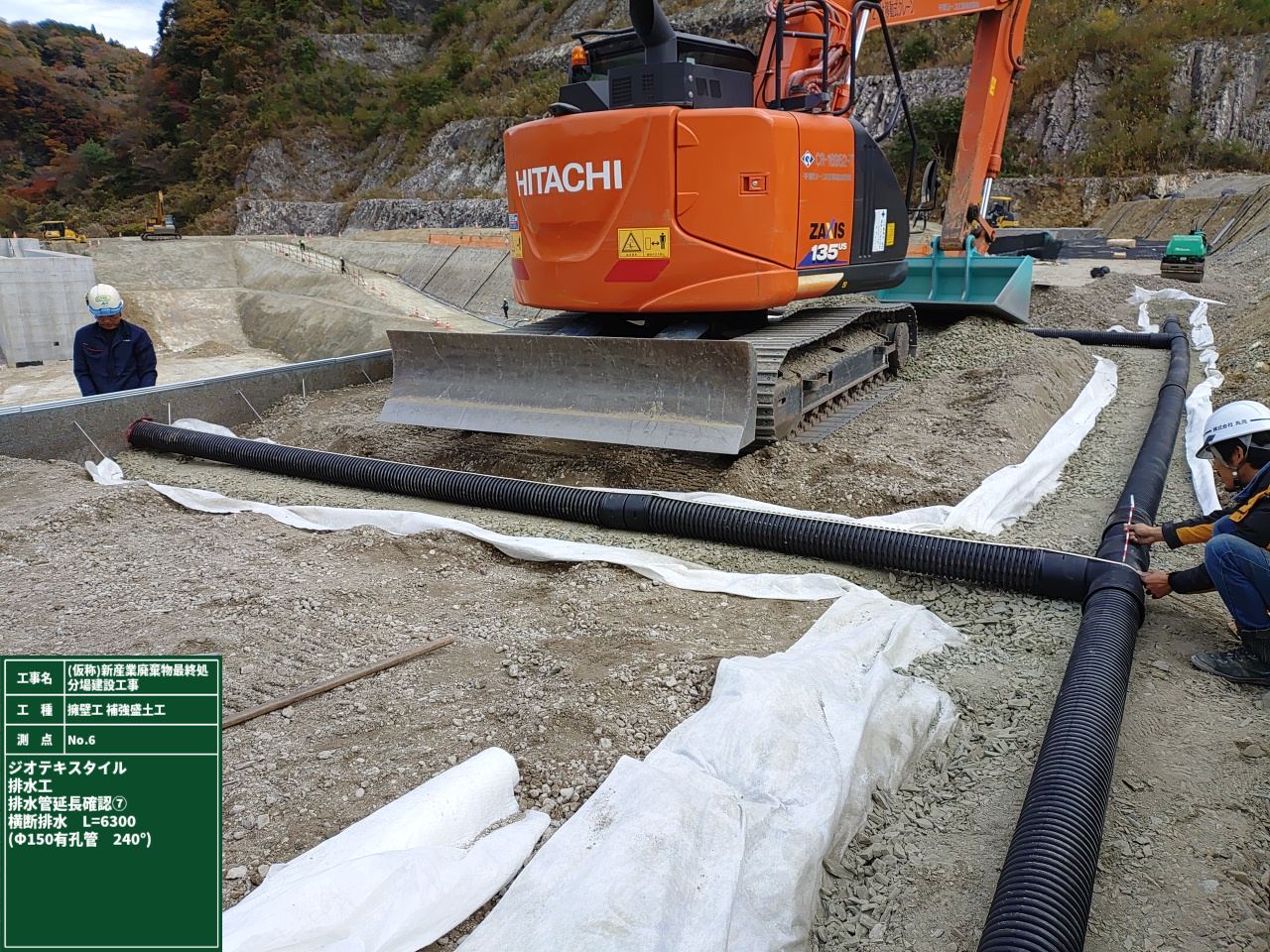 ①補強土盛土底部の排水処理のため排水管を設置します。