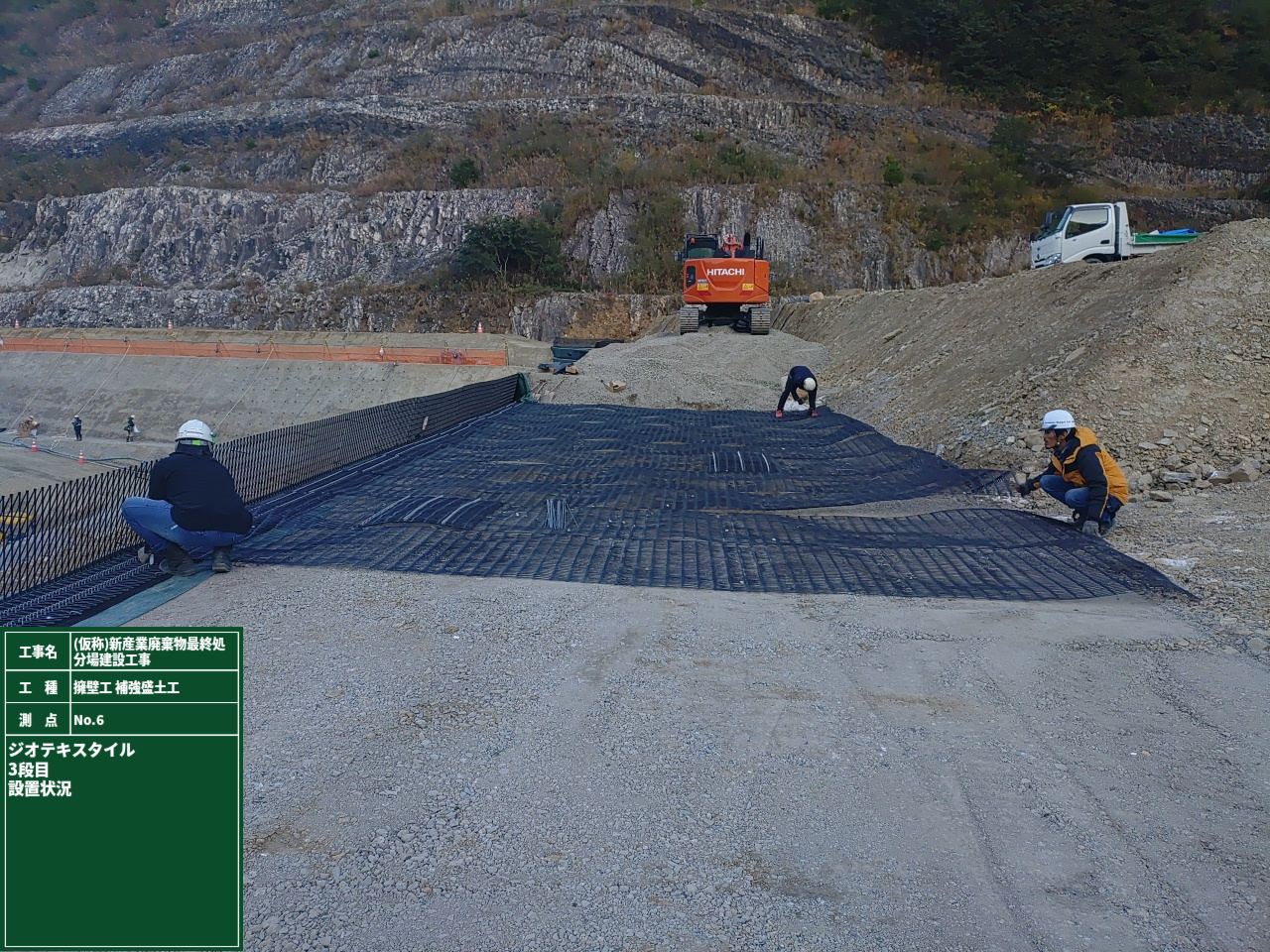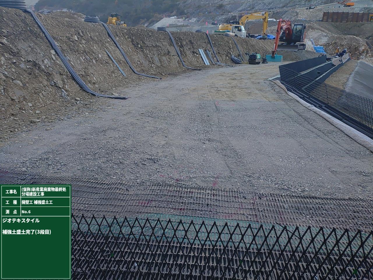③1段ごとに、壁面補強設置・不織布シート取付・壁面支持材取付・床面の補強材設置・盛土を繰り返し、計画高さまで施工を繰り返します。
