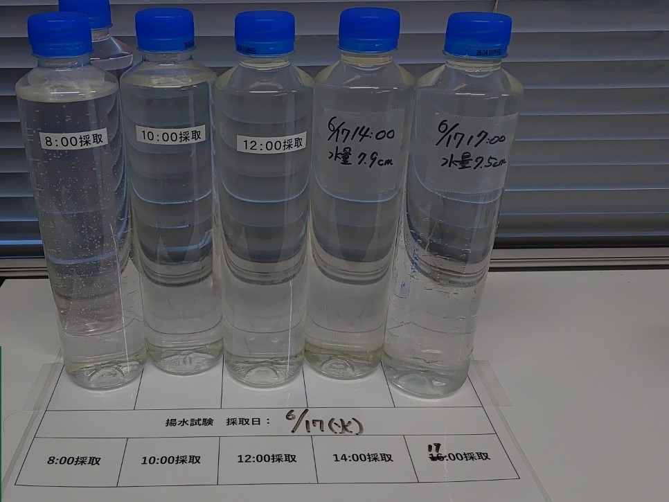 1枚目が水質試験用の検体を採水している状況、2枚目が採水した井戸水です。