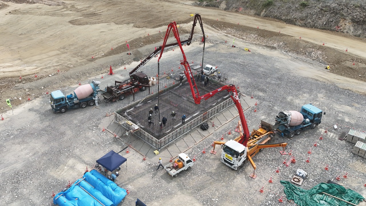 裏山堆積場では、セメント改良材を使用した盛土を行うために試験盛土を行っています。