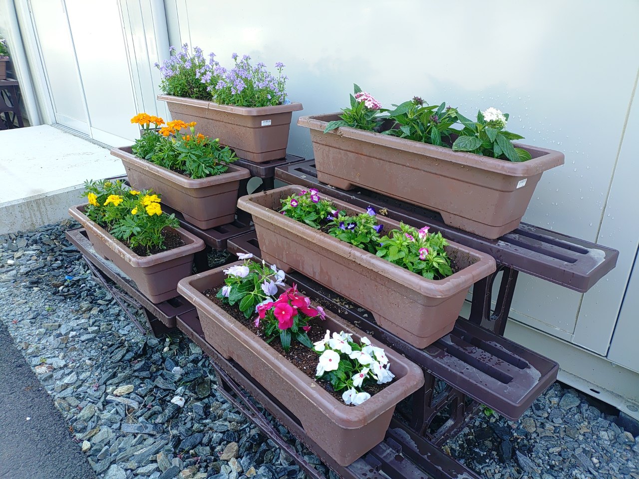 夏の兆しを感じる季節となり、花壇の入替を行いました。